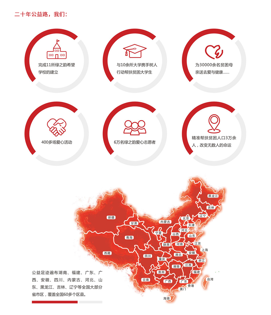 綠之韻公益基金會陸續(xù)投入1000萬元開展綠之韻樹人行動——以大學生影響小學生,開展“精神扶貧、勵志教育”活動,首先在選定的大學里以現(xiàn)金的形式資助困難大學生,受資助大學生后期受邀到綠之韻希望小學進行志愿支教活動,搭建起大學生與綠之韻……
