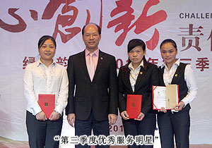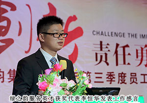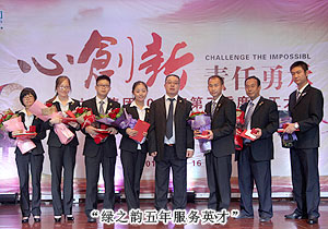 “綠之韻五年服務英才”是此次大會最受關注的獎項,五年前加入公司的羅嬋、馬曉玉、李恒華、羅婷、楊蔚、李智炎、趙光意這七名員工,伴隨公司成長,一路見證了企業(yè)的飛速發(fā)展和成熟,用忠誠為綠之韻的發(fā)展傾情奉獻。會上,胡國安董事長為獲獎的七名服務英才頒發(fā)香港周大福珠寶公司特約設計師量身定做的、鐫刻獲獎者名字的足金榮譽徽章和獎金。