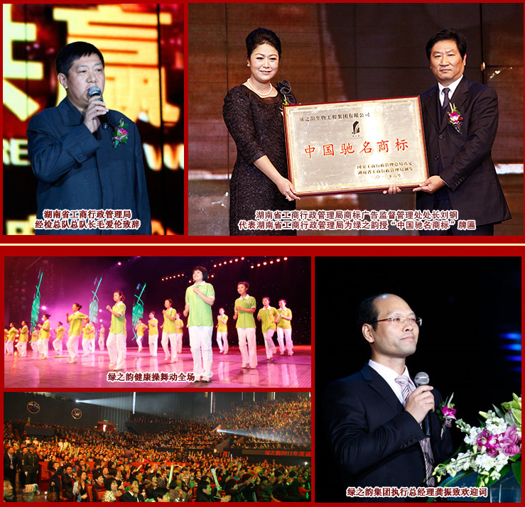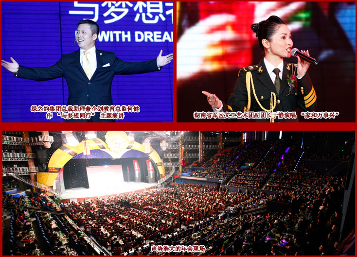 歲末年終,是全體綠之韻人檢閱成果的時(shí)候,是夢(mèng)想與榮光璀璨綻放的時(shí)候,更是全球綠之韻營(yíng)銷精英回家團(tuán)圓的時(shí)候!2011,綠之韻八周年,在這個(gè)福澤飽滿的年份,無(wú)數(shù)雙在前行路上緊握的手,締造了一個(gè)蓄勢(shì)待發(fā)、和諧共贏的嶄新局面。12月3日,綠之韻“同鑄夢(mèng)想?共贏未來(lái)”年度盛會(huì)在湖南長(zhǎng)沙華彩開(kāi)幕,政府領(lǐng)導(dǎo)、集團(tuán)高管、媒體嘉賓以及來(lái)自海內(nèi)外的3000多名營(yíng)銷伙伴匯聚長(zhǎng)沙,同襄盛舉!