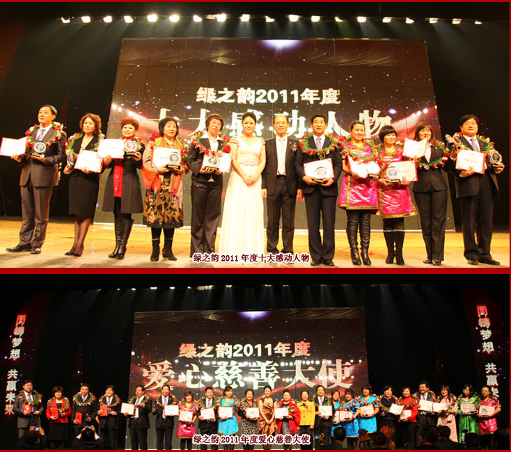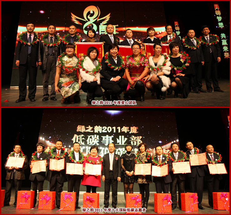 八年,在綠之韻慈善基金的號(hào)召下,無(wú)數(shù)綠之韻人加入愛(ài)心行列,向留守兒童、孤寡老人、寒門(mén)學(xué)子傾注無(wú)限的關(guān)懷與牽掛。是的,總有那么一群人,用鐵肩扛起責(zé)任,且行且付出,成為當(dāng)之無(wú)愧的“綠之韻2011年度愛(ài)心慈善大使”。21位營(yíng)銷精英在三千精英的見(jiàn)證下,從長(zhǎng)沙市青少年發(fā)展基金會(huì)理事長(zhǎng)羊舒麟、綠之韻集團(tuán)董事常務(wù)副總裁勞嘉手中接過(guò)榮譽(yù)牌匾,帶上鮮花頸環(huán),感受那熾熱的尊重。同時(shí),綠之韻內(nèi)蒙古分公司、山東分公司、湖南分公司分別憑借在“希望小學(xué)”、“樹(shù)人行動(dòng)”捐贈(zèng)行動(dòng)中的突出貢獻(xiàn)榮獲“綠之韻2011年度愛(ài)心團(tuán)隊(duì)”稱號(hào),綠之韻集團(tuán)總經(jīng)理助理陳晨代表慈善基金為他們頒發(fā)愛(ài)心錦旗。 “綠之韻2011年度十大國(guó)際低碳志愿者”獎(jiǎng)項(xiàng)揭曉,綠之韻集團(tuán)執(zhí)行總經(jīng)理龔振、綠之韻低碳產(chǎn)業(yè)事業(yè)部總裁戴嶸為獲獎(jiǎng)?wù)哳C獎(jiǎng)。