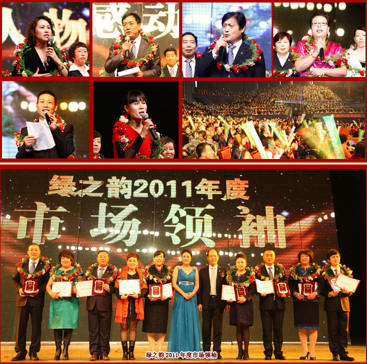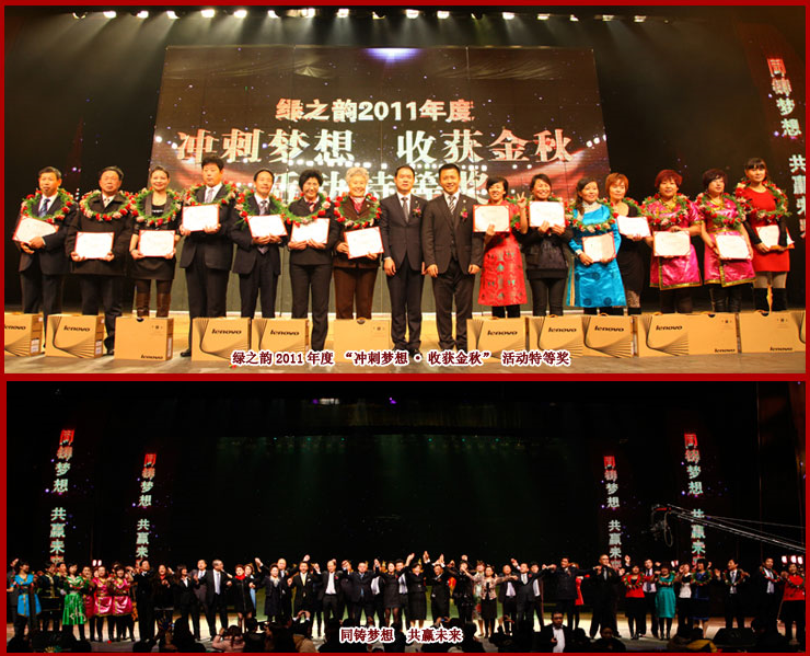 榮譽(yù)是汗水與淚水交織的喜悅,是實(shí)力與夢(mèng)想齊發(fā)的綻放,本次盛會(huì),“綠之韻2011年度市場(chǎng)領(lǐng)袖”首度頒發(fā),“沖刺夢(mèng)想,收獲金秋活動(dòng)特等獎(jiǎng)”現(xiàn)場(chǎng)頒發(fā)筆記本電腦。“與夢(mèng)想同行”—— 綠之韻集團(tuán)總裁助理兼企劃教育總監(jiān)何健的主題演講,從集團(tuán)幾項(xiàng)重大的發(fā)展規(guī)劃中再一次深刻地詮釋夢(mèng)想的力量。八年之情,百年之路,所有獲獎(jiǎng)?wù)叨际鞘聵I(yè)的標(biāo)桿,成功的楷模,請(qǐng)所有心懷夢(mèng)想的綠之韻攜起手來(lái),追尋成功者的足跡,共同續(xù)寫(xiě)綠之韻的輝煌與傳奇。