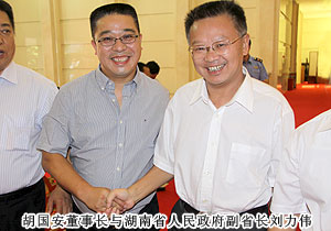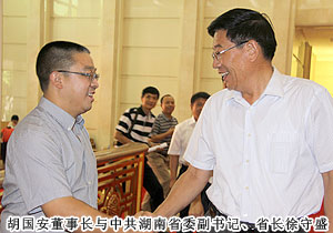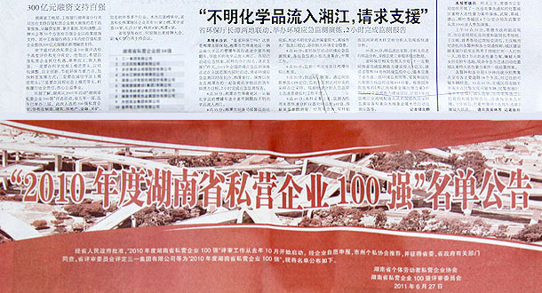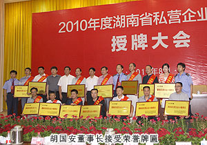2011年8月16日,湖南省私營(yíng)企業(yè)100強(qiáng)授牌大會(huì)在長(zhǎng)沙隆重舉行。中共湖南省委副書記、省長(zhǎng)徐守盛、中國個(gè)體勞動(dòng)者協(xié)會(huì)會(huì)長(zhǎng)甘國屏、省人民政府副省長(zhǎng)劉力偉、湖南省人大常委會(huì)副主任陳叔紅、湖南省政協(xié)副主席、省工商聯(lián)會(huì)長(zhǎng)何報(bào)翔等省市領(lǐng)導(dǎo)出席頒獎(jiǎng)儀式。綠之韻集團(tuán)作為湖南省重點(diǎn)企業(yè),榮耀晉升“2010年度湖南省私營(yíng)企業(yè)100強(qiáng)”行列,胡國安董事長(zhǎng)應(yīng)邀出席頒獎(jiǎng)儀式,得到了省市各級(jí)領(lǐng)導(dǎo)的肯定和贊許。