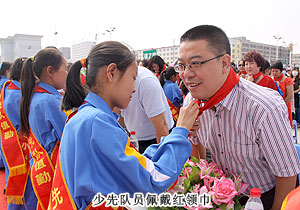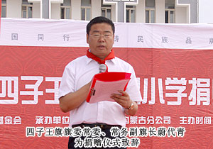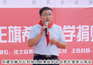 捐贈儀式現(xiàn)場,上百名綠之韻愛心精英共舞《中國人》,昂揚的氣勢,莊嚴的氛圍震撼全場。因為同是中國人,同在藍天下,所以我們更要像孟子所希望的一樣“老吾老以及人之老,幼吾幼以及人之幼”,奉獻自己力所能及的愛心,為社會輸送溫暖,讓感動在每一個人的心中升溫。少先隊員為蒞臨現(xiàn)場的領(lǐng)導和嘉賓敬獻紅領(lǐng)巾,那一抹鮮紅代表著光榮,代表著感恩,它在每一位愛心人士的胸前飄揚,讓綠之韻人的責任更加重大。四子王旗常委、常務(wù)副旗長蔚代青致歡迎辭,對綠之韻集團的大愛無疆表示誠摯的謝意和肯定。胡國安董事長發(fā)言,他表示:教育是立國之本,作為優(yōu)秀的企業(yè)公民,綠之韻始終堅持“企業(yè)做大了就是屬于國家、屬于社會的”這一社會責任理念,為捐建38所綠之韻希望小學的目標堅持不懈。草原是雄鷹的故鄉(xiāng),作為同樣從大山里走出來的孩子,胡國安董事長深深知道每一個孩子心中的夢想,希望孩子們能像鷹一樣,在學習中志存高遠,鷹擊長空。