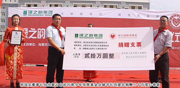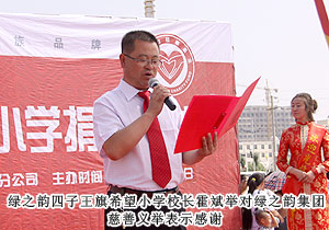 2011年7月20日,位于內(nèi)蒙古自治區(qū)烏蘭察布市的四子王旗熱鬧非凡--綠之韻四子王旗希望小學在此舉行隆重的捐贈儀式。內(nèi)蒙古自治區(qū)青少年發(fā)展基金會秘書長劉建忠、四子王旗旗委、常務(wù)副旗長蔚代青、政協(xié)副主席于有升、四子王旗工商局局長董明、副局長賈晉峰等政府領(lǐng)導及各界媒體嘉賓蒞臨,綠之韻集團董事長胡國安、執(zhí)行總經(jīng)理龔振、綠之韻慈善基金總執(zhí)行戴曉彥不遠萬里趕赴捐贈現(xiàn)場,內(nèi)蒙古分公司經(jīng)理候立新、內(nèi)蒙古地區(qū)愛心大使代表王連坤、郝建兵、張聞英以及2000余名綠之韻愛心大使參與愛心傳遞。
