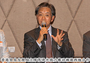蘇澤光主席表示,最近,湖南在香港很“熱”,越來越多的港企來到湖南投資。香港貿(mào)發(fā)局將進一步發(fā)揮窗口和橋梁作用,推動湘港兩地在現(xiàn)代服務(wù)業(yè)、創(chuàng)意產(chǎn)業(yè)等領(lǐng)域深化合作,幫助湘企借助香港平臺走向世界。