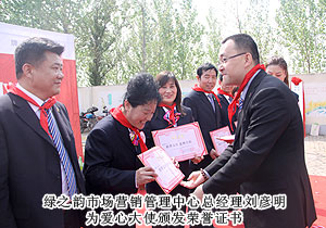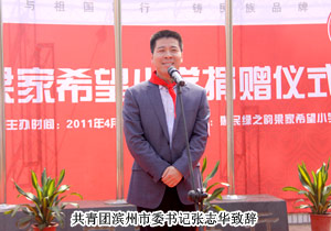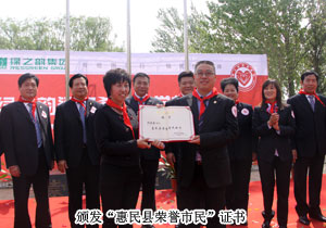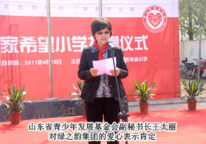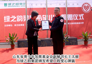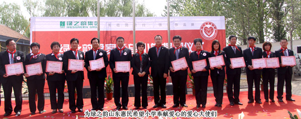 山東省青少年基金會副秘書長王太麗接受捐贈,并對綠之韻集團對社會的人文關懷表示肯定?;菝窨h人大常委會副主任張秀奎與綠之韻集團胡國安董事長共同為希望小學揭牌,并向胡國安董事長頒發(fā)了惠民縣榮譽市民證書。
