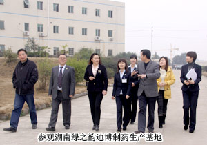 2011年2月23日,第十一屆全國人大代表、湖南省工商聯(lián)(總商會(huì))副主席李曦、湖南省工商聯(lián)經(jīng)濟(jì)聯(lián)絡(luò)處處長肖翔一行蒞臨綠之韻集團(tuán)就湖南省“萬企聯(lián)村、共同發(fā)展”活動(dòng)對(duì)企業(yè)進(jìn)行考察。在綠之韻集團(tuán)董事長胡國安的陪同下,李曦副主席一行參觀了綠之韻湖南迪博制藥生產(chǎn)廠、綠之韻GMP生產(chǎn)基地暨現(xiàn)代化物流中心、綠之韻國際大酒店等地。