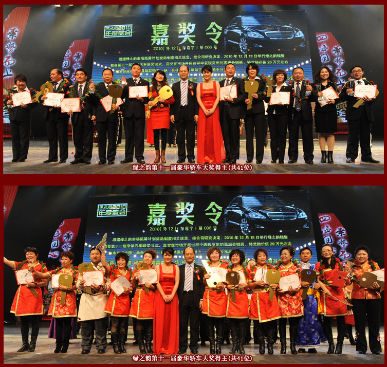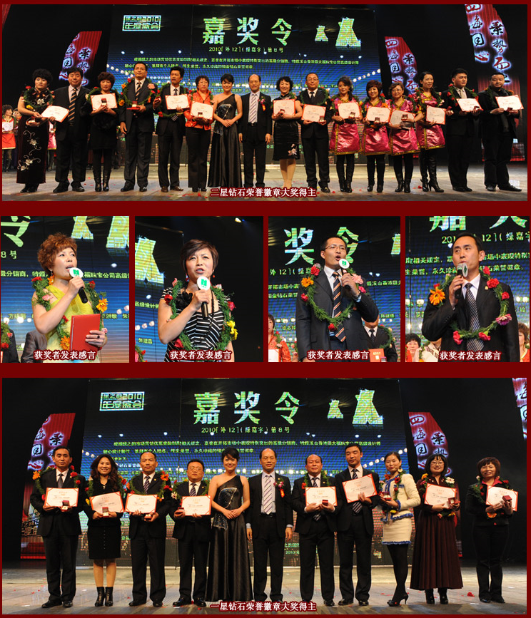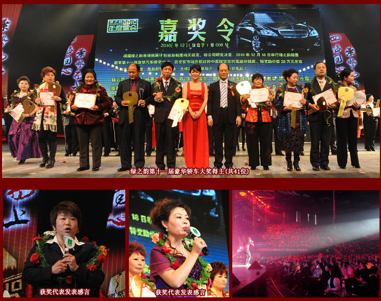 在星光閃耀、榮光無(wú)限的年會(huì)頒獎(jiǎng)舞臺(tái),曾經(jīng)含淚播種的英雄,此刻含笑收獲。2010年度星級(jí)鉆石榮譽(yù)徽章大獎(jiǎng)、2010年度豪華轎車(chē)大獎(jiǎng)、2010年店鋪銷(xiāo)售獎(jiǎng)、2010年度上半年新店銷(xiāo)售獎(jiǎng),每一項(xiàng)榮譽(yù)都是曾經(jīng)努力奮斗的佐證。他們,在開(kāi)拓中崛起,在堅(jiān)持中壯大,奔跑的腳步從未停歇,在他們的感言分享中,我們可以見(jiàn)證綠之韻人逐夢(mèng)的力量,感受夢(mèng)想實(shí)現(xiàn)的喜悅與感動(dòng)。