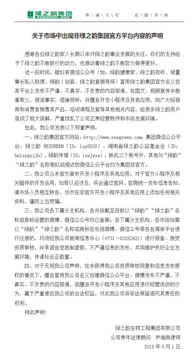 鄭重聲明(關(guān)于市場(chǎng)中出現(xiàn)非綠之韻集團(tuán)官方平臺(tái)內(nèi)容的聲明)