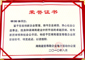 2010年8月28日,由湖南省科技廳、湖南省國(guó)家稅務(wù)局、湖南企業(yè)發(fā)展調(diào)研辦公室、湖南發(fā)展研究中心等單位聯(lián)合舉辦的"第三屆湖南最受尊敬企業(yè)推介"頒獎(jiǎng)盛典暨新聞通報(bào)會(huì)在湖南蓉園賓館舉行。湖南省人大常委會(huì)黨組成員、省政府顧問唐之享、原湖南省委書記熊清泉、原湖南省政協(xié)主席劉夫生等老領(lǐng)導(dǎo)出席本次頒獎(jiǎng)活動(dòng)?!逗先?qǐng)?bào)》、《瀟湘晨報(bào)》、紅網(wǎng)、長(zhǎng)沙新聞?lì)l道等多家媒體對(duì)本次評(píng)選給予高度關(guān)注。綠之韻集團(tuán)榮獲“湖南最受尊敬企業(yè)”榮譽(yù)稱號(hào),胡國(guó)安董事長(zhǎng)被授予“湖南最受尊敬企業(yè)家”榮譽(yù)稱號(hào)。