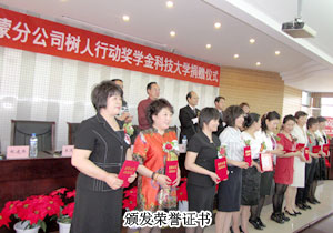 活動現(xiàn)場,綠之韻集團(tuán)執(zhí)行總經(jīng)理龔振先生致辭,鼓勵大學(xué)生們胸懷理想,好好學(xué)習(xí)、回饋社會、報(bào)效祖國。 隨后,綠之韻集團(tuán)向內(nèi)蒙古科技大學(xué)10位品學(xué)兼優(yōu)的寒門學(xué)子頒發(fā)《獎學(xué)金證書》并每位捐贈5000元款物。綠之韻集團(tuán)執(zhí)行總經(jīng)理龔振和學(xué)工部部長王軍一同走上舞臺,向王連坤、郝建兵、張聞英、張文英、張紅菲、張雨菲、張聞華、周淑梅、劉美成、馬麗英十位綠之韻愛心分銷商代表頒發(fā)榮譽(yù)證書。學(xué)工部部長王軍代表受捐助的學(xué)子以及校方對綠之韻樹人行動的慷慨捐助表示衷心的感謝,充分肯定綠之韻企業(yè)以及分銷商們的善舉為家庭經(jīng)濟(jì)困難學(xué)生搭建了一座實(shí)現(xiàn)人生理想的橋梁,讓廣大學(xué)子深切感受到綠之韻人帶來的溫暖。綠之韻愛心代表郝建兵在致辭中說,內(nèi)蒙古地區(qū)的綠之韻人,時刻都沒有忘記用責(zé)任與愛心來幫助經(jīng)濟(jì)上困難的大學(xué)生。我堅(jiān)信受資助的學(xué)生一定會通過自己的努力,把自己鍛煉成一個有用的人,一個能夠回報(bào)社會的人,綠之韻人的愛心將持續(xù)撒播在內(nèi)蒙古的土地上,讓綠之韻人的“愛”得到永遠(yuǎn)的延續(xù)。