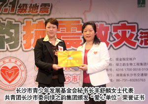 執(zhí)行總經(jīng)理龔振致捐款倡議書,向下屬公司、全國各地分公司、全國加盟專賣店及分銷員發(fā)出募捐倡議,號召全體綠之韻人向災區(qū)人民伸出援助之手,為災區(qū)送上一份愛心,點燃一份希望。會上,羊舒麟秘書長代表共青團長沙市委向綠之韻集團頒發(fā)“愛心單位”榮譽證書,勞嘉副總接受榮譽證書并表示:奉獻愛心,扶危濟困,綠之韻長久以來的經(jīng)營理念永遠離不開“回饋”二字,在綠之韻人的共同努力下,相信我們用愛心匯聚的暖陽,一定能驅(qū)散災難的陰霾!