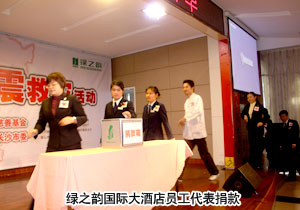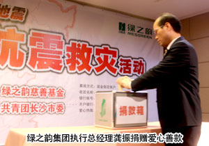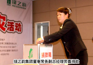 2010年4月18日,綠之韻集團“情系玉樹?共筑家園”抗震救災捐款活動在綠之韻國際大酒店貴賓樓舉辦,聯(lián)合長沙市青少年發(fā)展基金會向災區(qū)捐贈了第一筆愛心善款——30萬元現(xiàn)金及物資。共青團長沙市委副書記彭勇、長沙市青少年發(fā)展基金會秘書長羊舒麟代表災區(qū)現(xiàn)場接受捐贈。長沙市新聞頻道、長沙晚報等新聞媒體出席會議并現(xiàn)場報道捐款情況。綠之韻集團董事常務副總經(jīng)理勞嘉、執(zhí)行總經(jīng)理龔振、市場總監(jiān)諶獻軍等集團高管與集團總部、國際大酒店、迪博制藥廠的員工代表、第二十九屆區(qū)域(高級)經(jīng)理以及湖南地區(qū)分銷商代表現(xiàn)場踴躍捐款。胡國安董事長雖身在異地,但仍通過總裁辦捐助愛心善款,并表達了對災區(qū)同胞的關懷和鼓勵。