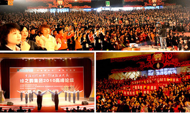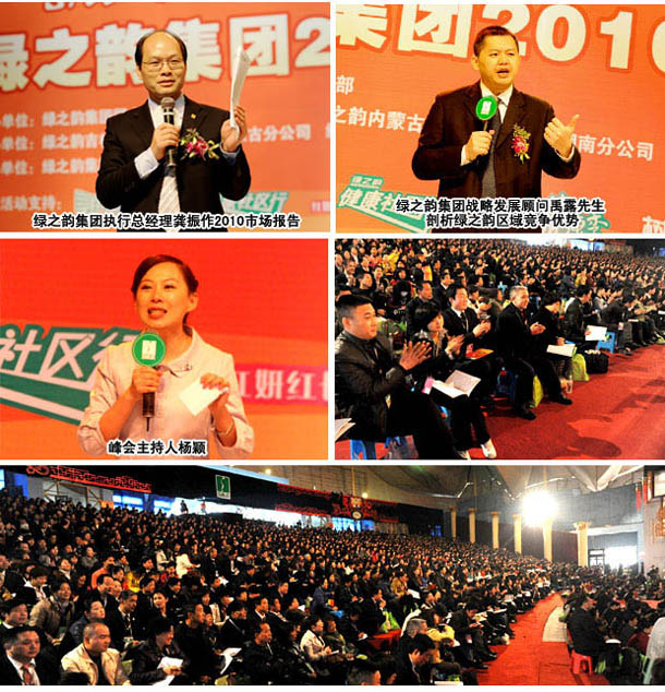 早晨七點(diǎn),陸續(xù)就有全國(guó)各地趕來的伙伴來到峰會(huì)現(xiàn)場(chǎng),這其中有連續(xù)四年、五年每年都來參與的骨干精英,也有第一次慕名前來感受峰會(huì)盛況的伙伴,雖然很多都是素不相識(shí),但回家的喜悅卻讓所有伙伴感到由衷的親切。歷屆年會(huì)、峰會(huì)集錦的視頻資料在會(huì)場(chǎng)大屏幕上播出,一幕幕場(chǎng)景再次觸動(dòng)了伙伴們的內(nèi)心,讓所有分銷伙伴感受到是因?yàn)閳?jiān)持才有了那么多記錄成長(zhǎng)的鏡頭,是辛勤的耕耘才有那么多收獲的掌聲。一天緊張有序的學(xué)習(xí)中,綠之韻集團(tuán)戰(zhàn)略發(fā)展顧問、行業(yè)知名專家禹露先生首先立足行業(yè),解析綠之韻獨(dú)特的企業(yè)文化、不可替代的行業(yè)競(jìng)爭(zhēng)區(qū)域優(yōu)勢(shì)以及企業(yè)發(fā)展中為社會(huì)所做的貢獻(xiàn)等成功優(yōu)勢(shì),幫助大家更多方面了解公司。綠之韻集團(tuán)執(zhí)行總經(jīng)理龔振作了綠之韻集團(tuán)2010年市場(chǎng)目標(biāo)報(bào)告,并以“世界的眼睛在看中國(guó)、中國(guó)的經(jīng)濟(jì)看民企、民企的發(fā)展看行業(yè)”為演講主題,激發(fā)了綠之韻人內(nèi)心的愛國(guó)精神和推動(dòng)綠之韻事業(yè)向前發(fā)展不可阻擋的氣勢(shì)。緊接著,綠之韻集團(tuán)與交通銀行聯(lián)合發(fā)行的視頻播放,贏得廣大分銷商的推崇,因?yàn)榫G之韻薪金卡是綠之韻人價(jià)值的體現(xiàn),展示出一份尊貴氣質(zhì),現(xiàn)場(chǎng)咨詢場(chǎng)面火爆異常。