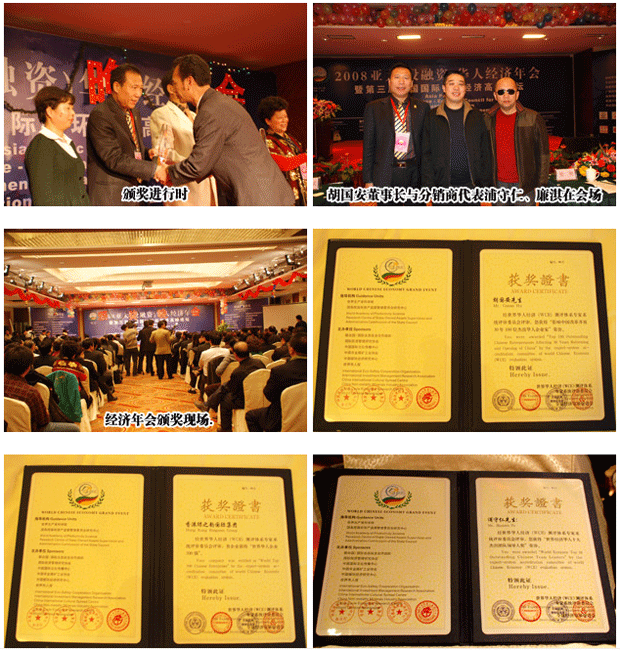 綠之韻集團胡國安董事長受邀全程出席此次會議,綠之韻集團榮獲“世界華人企業(yè)500強”榮譽大獎,胡國安董事長個人被評為“影響中國改革開放30年100位杰出華人企業(yè)家”, 全國工商聯(lián)副主席孫曉華為胡國安董事長頒獎; 綠之韻分銷商管理委員會會長浦守仁獲“2008年世界經(jīng)濟華人十大杰出團隊領(lǐng)導(dǎo)人獎”。