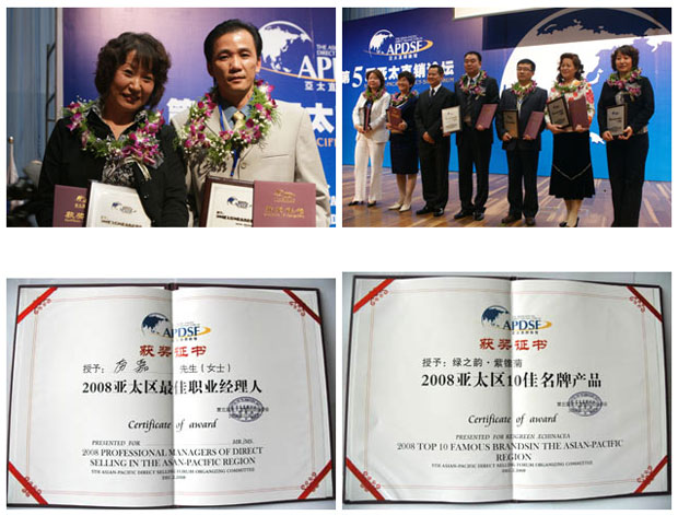 在此次論壇上,綠之韻集團(tuán)銀杏螺旋藻、玉感紫錐菊被評(píng)為“2008亞太區(qū)10佳名牌產(chǎn)品”。綠之韻集團(tuán)董事、常務(wù)副總經(jīng)理勞嘉獲“2008亞太區(qū)最佳職業(yè)經(jīng)理人”稱號(hào)。綠之韻集團(tuán)優(yōu)秀分銷商代表徐華榮獲“ 2008亞太區(qū)十佳善行典范經(jīng)銷商”、張吉福榮獲“2008亞太區(qū)十佳金牌培訓(xùn)師”、劉國(guó)立榮獲“ 2008 亞太區(qū)50位杰出經(jīng)銷商”、黃淑青榮獲“2008 亞太區(qū)50位杰出經(jīng)銷商 ”、史朋榮獲“ 2008 亞太區(qū)善行典范經(jīng)銷商”榮譽(yù)稱號(hào)。