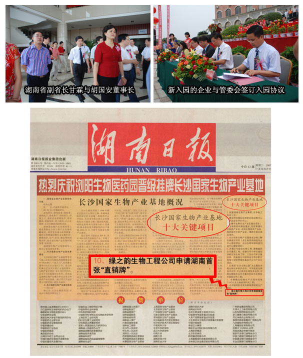 2007年6月12日上午九點(diǎn),綠之韻集團(tuán)國內(nèi)事業(yè)總部所在地瀏陽生物醫(yī)藥園舉行了晉級(jí)長(zhǎng)沙國家生物產(chǎn)業(yè)基地授牌儀式。國家發(fā)改委副主任張曉強(qiáng)、湖南省人民政府常務(wù)副省長(zhǎng)肖捷、湖南省副省長(zhǎng)甘霖、長(zhǎng)沙市副市長(zhǎng)劉曉明等領(lǐng)導(dǎo)出席儀式并講話。綠之韻集團(tuán)董事長(zhǎng)兼總裁胡國安先生、董事常務(wù)副總經(jīng)理勞嘉女士作為園區(qū)重點(diǎn)企業(yè)代表也受邀出席了儀式。
