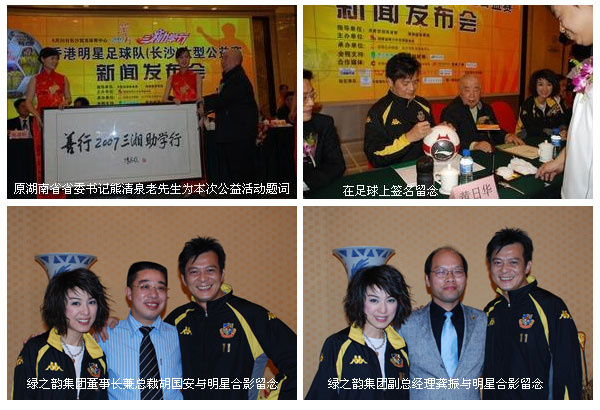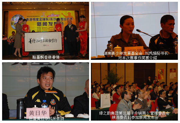 2007年4月26日下午三點(diǎn),由湖南省青少年發(fā)展基金會(huì)主辦,綠之韻集團(tuán)全程支持的“綠之韻杯善行2007·綠之韻三湘助學(xué)行”香港明星足球隊(duì)(長沙)大型公益賽新聞發(fā)布會(huì)在華雅國際大酒店隆重召開。原湖南省省委書記熊清泉擔(dān)任活動(dòng)名譽(yù)顧問,共青團(tuán)湖南省團(tuán)委副書記張值恒、湖南省體育局副局長熊倪等出席了新聞發(fā)布會(huì),綠之韻集團(tuán)董事長兼總裁胡國安先生、香港明星足球隊(duì)領(lǐng)隊(duì)及代表黃日華、米雪、尹志強(qiáng)和湖南愛心聯(lián)隊(duì)領(lǐng)隊(duì)王可維出席會(huì)議并分別發(fā)表講話。湖南省的電視、報(bào)紙、雜志、電臺(tái)、網(wǎng)絡(luò)等30多家媒體到現(xiàn)場采訪。綠之韻集團(tuán)第三屆(分銷商)咨詢管理委員會(huì)的50多位候補(bǔ)委員們亦受邀參加新聞發(fā)布會(huì)為活動(dòng)助興。