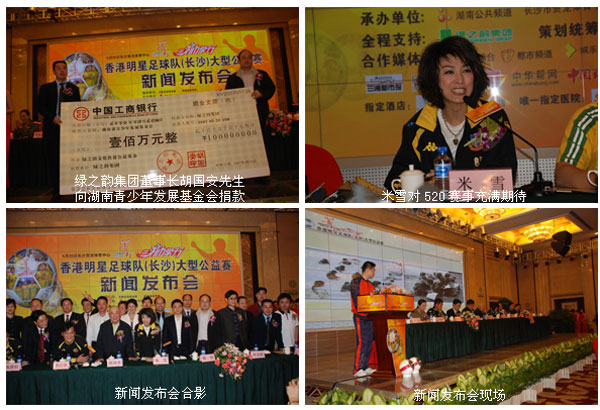 新聞發(fā)布會(huì)上,湖南省青少年發(fā)展基金會(huì)秘書長劉鳳娟對本次賽事進(jìn)行了簡要介紹,并重點(diǎn)就綠之韻集團(tuán)熱心公益的慈善義舉表示贊許。本次公益賽事活動(dòng)定于2007年5月20日下行三點(diǎn)在長沙市賀龍?bào)w育中心舉行,香港隊(duì)將由譚詠麟、曾志偉、任達(dá)華等明星領(lǐng)銜出場,對決由綠之韻集團(tuán)組成的綠之韻愛心聯(lián)隊(duì),本次活動(dòng)心系貧困兒童,關(guān)注山區(qū)教育事業(yè),綠之韻集團(tuán)所籌善款將全部贈(zèng)予湖南省青少年發(fā)展基金會(huì),致力于幫助全國各地貧困兒童重回課堂。