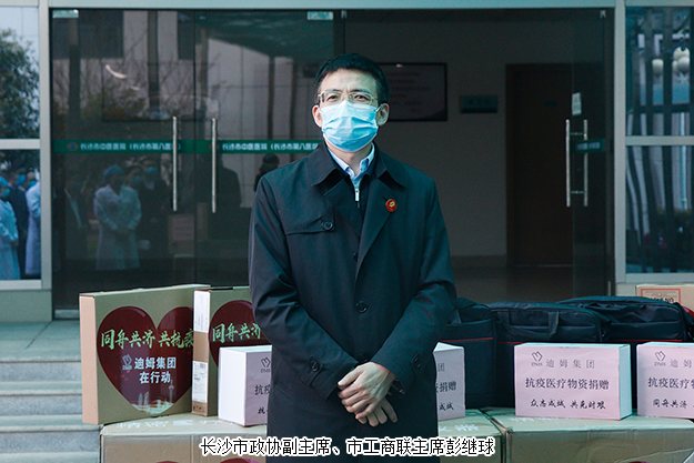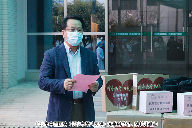 2020年3月20日,長沙市工商聯(lián)、湖南省長沙市光彩事業(yè)基金會抗擊新冠肺炎疫情愛心捐贈儀式在長沙舉行。長沙市政協(xié)副主席、市工商聯(lián)主席彭繼球,市工商聯(lián)副主席劉立紅;湖南省長沙市光彩事業(yè)基金會理事長、綠之韻集團董事長胡國安;長沙市中醫(yī)醫(yī)院(長沙市第八醫(yī)院)黨委書記鄧雄飛,黨委副書記、院長周繼如,副院長黃征宇、吳小寧、唐勇;迪姆錦源(湖南)科技有限公司董事長吳余生等領(lǐng)導(dǎo)出席捐贈儀式。