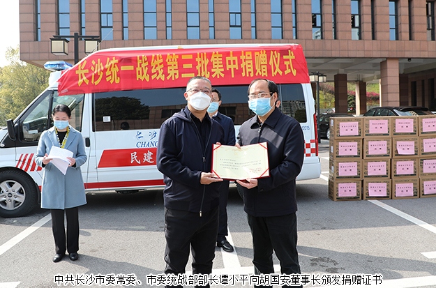 2020年3月18日,長(zhǎng)沙市統(tǒng)一戰(zhàn)線第三批集中捐贈(zèng)儀式在長(zhǎng)沙市慈善基金會(huì)前坪舉行。中共長(zhǎng)沙市委常委、市委統(tǒng)戰(zhàn)部部長(zhǎng)譚小平,長(zhǎng)沙市民政局黨組書(shū)記、局長(zhǎng)、市慈善總會(huì)副會(huì)長(zhǎng)陳昌佳,中共長(zhǎng)沙市委統(tǒng)戰(zhàn)部常務(wù)副部長(zhǎng)劉映群,中共長(zhǎng)沙市委統(tǒng)戰(zhàn)部副部長(zhǎng)、長(zhǎng)沙市僑聯(lián)黨組書(shū)記王國(guó)平等領(lǐng)導(dǎo)出席活動(dòng),市委統(tǒng)戰(zhàn)部、市民政局、市民宗局、市慈善總會(huì)有關(guān)負(fù)責(zé)同志,各民主黨派市委負(fù)責(zé)同志,市黨外知識(shí)分子聯(lián)誼會(huì)負(fù)責(zé)同志,市宗教界代表人士,市海外聯(lián)誼會(huì)、香港長(zhǎng)沙聯(lián)誼會(huì)代表人士參加活動(dòng)。湖南省政協(xié)委員、長(zhǎng)沙市海外聯(lián)誼會(huì)副會(huì)長(zhǎng)、綠之韻集團(tuán)董事長(zhǎng)胡國(guó)安受邀參加活動(dòng)。