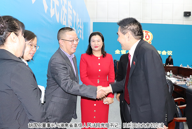 胡國(guó)安董事長(zhǎng)參加完此次工作會(huì)議感慨頗深,他為各級(jí)人民法庭認(rèn)真履行使命擔(dān)當(dāng),為社會(huì)經(jīng)濟(jì)發(fā)展提供優(yōu)良的司法服務(wù)和堅(jiān)實(shí)的司法保障點(diǎn)贊。他表示,近年來,政府部門積極構(gòu)建“親”“清”新型政商關(guān)系,高度重視優(yōu)化民營(yíng)企業(yè)的營(yíng)商環(huán)境工作。日前,國(guó)務(wù)院出臺(tái)了《優(yōu)化營(yíng)商環(huán)境條例》,把近年來有關(guān)優(yōu)化營(yíng)商環(huán)境的政策措施、經(jīng)驗(yàn)做法進(jìn)一步系統(tǒng)化、規(guī)范化,把政策提倡、工作要求和實(shí)踐做法變成全社會(huì)具有法律約束力的制度規(guī)范,將更好地穩(wěn)定各類市場(chǎng)主體的預(yù)期,提振我們民營(yíng)企業(yè)家心無旁騖干事業(yè)的決心和信心。22日,湖南省人民政府又印發(fā)了《湖南省優(yōu)化經(jīng)濟(jì)發(fā)展環(huán)境規(guī)定》的通知,長(zhǎng)沙等各市州也都相繼出臺(tái)了《“營(yíng)商環(huán)境優(yōu)化年”實(shí)施方案》等系列重要文件,努力把優(yōu)化營(yíng)商環(huán)境作為實(shí)施“創(chuàng)新引領(lǐng)、開放崛起”戰(zhàn)略、建設(shè)富饒美麗新湖南的重大舉措。胡國(guó)安董事長(zhǎng)表示,人民法庭工作的進(jìn)一步提升和推進(jìn),對(duì)于營(yíng)造法治化營(yíng)商環(huán)境,打造穩(wěn)定、公正、公平、透明、可預(yù)期的經(jīng)濟(jì)發(fā)展環(huán)境,保護(hù)民營(yíng)企業(yè)發(fā)展,進(jìn)一步激發(fā)民營(yíng)企業(yè)發(fā)展動(dòng)力,推動(dòng)全省經(jīng)濟(jì)社會(huì)持續(xù)健康發(fā)展將發(fā)揮出積極作用。