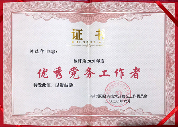 隨后,瀏陽經(jīng)開區(qū)(高新區(qū))黨工委副書記、管委會副主任尋院豪宣讀七一表彰文件。與會領(lǐng)導(dǎo)為獲得表彰的企業(yè)和個(gè)人頒獎(jiǎng)。綠之韻集團(tuán)憑借出色的黨建工作被中共長沙市委組織部評為“黨建示范點(diǎn)”“抗擊新冠肺炎疫情先進(jìn)基層黨組織”;綠之韻集團(tuán)董事、總裁勞嘉被瀏陽經(jīng)開區(qū)(高新區(qū))授予“支持黨建優(yōu)秀企業(yè)家”榮譽(yù)稱號;綠之韻集團(tuán)黨委副書記許達(dá)仲被評為“優(yōu)秀黨務(wù)工作者”;黨員趙光意、宋沂芳被評為“優(yōu)秀共產(chǎn)黨員”。