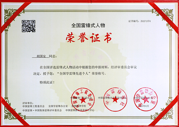 為深入貫徹黨的十九大精神,落實(shí)中共中央辦公廳《關(guān)于深入開展學(xué)雷鋒活動的意見》,推動學(xué)雷鋒活動常態(tài)化,弘揚(yáng)社會主義核心價值觀,中國雷鋒工程委員會、全國學(xué)雷鋒辦公室、中國雷鋒報社美育研究中心在全國開展了“2020全國學(xué)雷鋒先進(jìn)人物”評選活動。經(jīng)活動評審委員會審議,授予綠之韻集團(tuán)董事長胡國安“全國學(xué)雷鋒先進(jìn)個人”榮譽(yù)稱號。