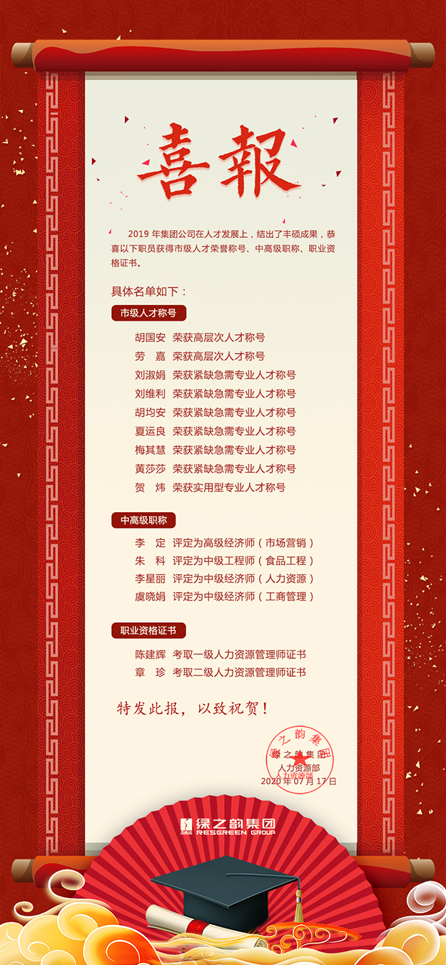 人才是衡量一個企業(yè)實力的重要指標。從企業(yè)自身發(fā)展來看,人才始終是綠之韻屹立十七年、歷久彌新的“秘訣”。在綠之韻的企業(yè)管理實踐中,“人本思想”任何時候都是基石。綠之韻一直致力于全力構(gòu)建學(xué)習(xí)型團隊、企業(yè),打造人才實現(xiàn)夢想的事業(yè)平臺。活動現(xiàn)場,綠之韻集團人力資源部宣讀了2019 年獲得省市級人才稱號、職稱證書、職業(yè)資格證書的員工名單。全場響起熱烈的掌聲向優(yōu)秀的綠之韻人表示祝賀。