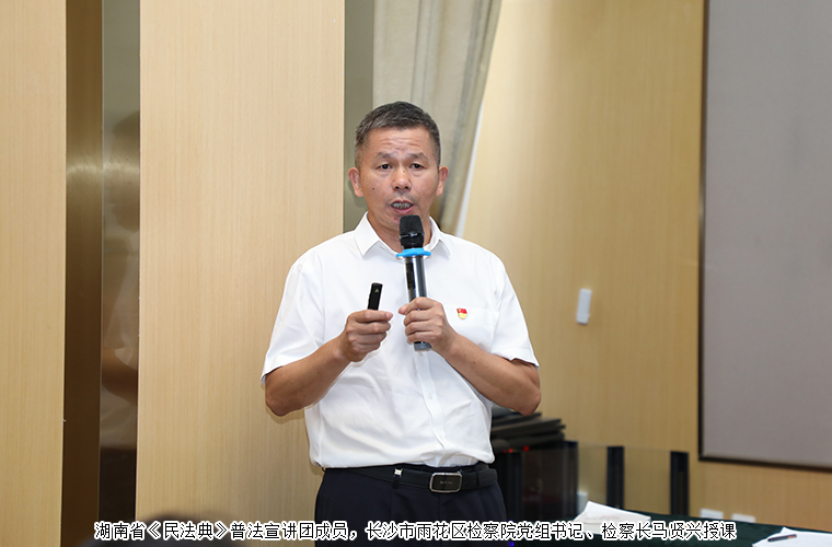 湖南省《民法典》普法宣講團成員,長沙市雨花區(qū)檢察院黨組書記、檢察長馬賢興以“讓《民法典》走進人民,走進你我他”為主題,從擁抱《民法典》、學(xué)習(xí)《民法典》、運用《民法典》三個方面入手,對《民法典》的誠信原則、綠色原則、優(yōu)良家風(fēng)、夫妻共同債務(wù)、離婚冷靜期、土地流轉(zhuǎn)、居住權(quán)制度、舊小區(qū)加裝電梯、未成年人特別保護等與群眾日常生活息息相關(guān)的法律條文進行了生動、詳實的解讀。他通過新舊法規(guī)變化對比、案例解析,深入淺出解釋法律規(guī)定,激發(fā)了大家主動學(xué)習(xí)《民法典》的興趣。馬賢興檢察長授課內(nèi)容言辭幽默、內(nèi)容殷實、貼近實際,兼具理論性與現(xiàn)實性,員工們聽得全神貫注,認(rèn)真仔細(xì)記錄講課要點,不時發(fā)出陣陣熱烈的掌聲。