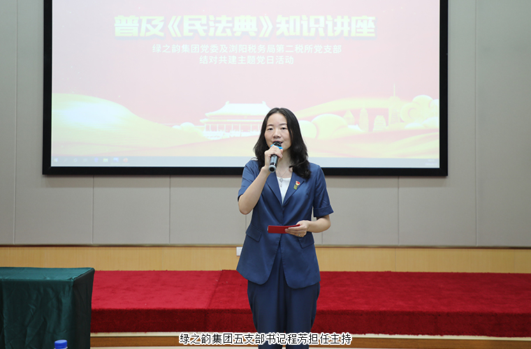 為響應(yīng)中央八部委辦學(xué)習(xí)宣傳《民法典》要求,進一步培育全體員工法治思維,真正把《民法典》宣傳融入到企業(yè)法治實踐全過程,營造出學(xué)法守法用法的良好氛圍,2020年8月25日,綠之韻集團黨委聯(lián)合瀏陽市稅務(wù)局第二稅務(wù)所黨支部共同舉辦的普及《民法典》知識講座暨主題黨日活動在集團公司國際會議中心會議室舉行。本次活動特別邀請到了湖南省《民法典》普法宣講團成員,長沙市雨花區(qū)檢察院黨組書記、檢察長馬賢興為全體員工帶來了一堂生動精彩的法治盛宴。瀏陽市稅務(wù)局第二稅務(wù)所所長雷衛(wèi)東、瀏陽市稅務(wù)局第二稅務(wù)所黨支部書記潘曉明 、瀏陽經(jīng)開區(qū)企業(yè)黨委黨建科科長胡曉江;綠之韻集團董事、總裁勞嘉,副總裁劉淑娟、胡均安,副總經(jīng)理梅其慧,黨委書記劉云等領(lǐng)導(dǎo)參加活動。