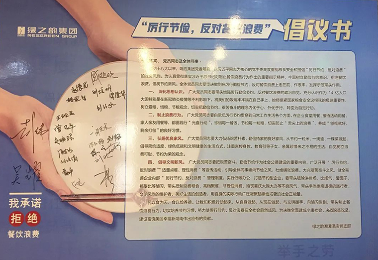 9月7日-10日,綠之韻集團黨委下屬國際大酒店支部、湘潭酒店支部、保健日用品支部紛紛響應,組織員工簽署“光盤行動”倡議書,在全公司上下掀起了厲行節(jié)約的良好氛圍。