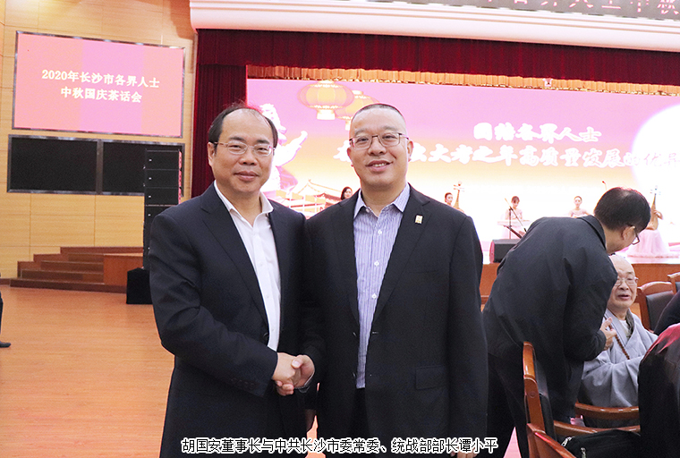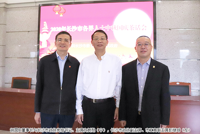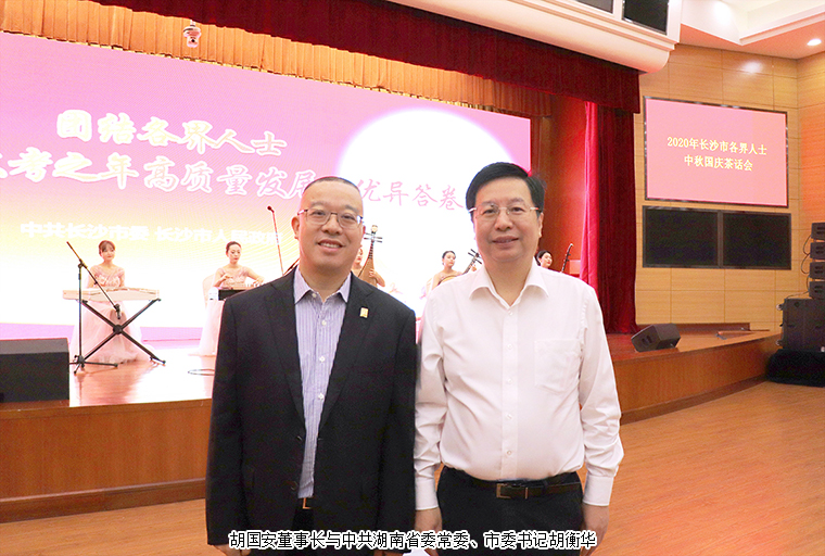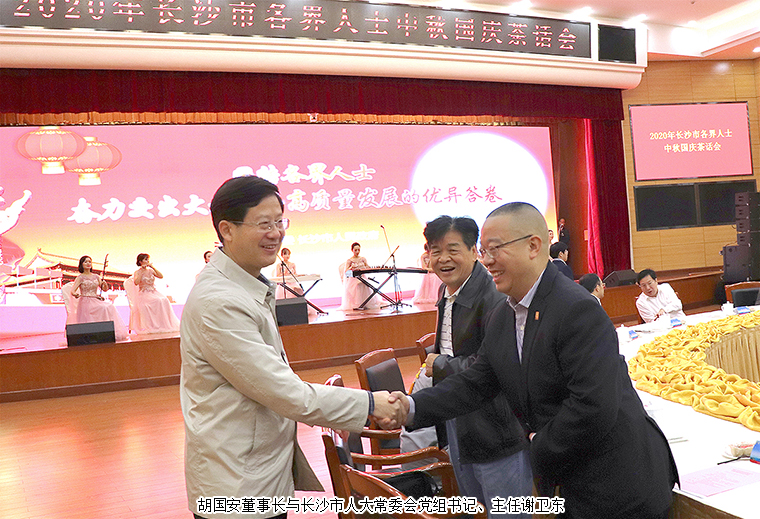 2020年9月28日,由中共長沙市委、長沙市政府主辦的2020年長沙市各界人士中秋國慶茶話會在長沙市會議中心召開。中共湖南省委常委、長沙市委書記胡衡華,長沙市人大常委會黨組書記、主任謝衛(wèi)東,長沙市政協(xié)黨組書記、主席文樹勛,中共長沙市委常委、統(tǒng)戰(zhàn)部部長譚小平以及全市離退休老同志、各界人士共同出席活動。湖南省政協(xié)委員、香港長沙聯(lián)誼會名譽會長、香港長沙商會常務(wù)副會長、綠之韻集團董事長胡國安受邀出席活動,與參會嘉賓歡聚一堂,共敘友情、共謀發(fā)展,共慶中秋佳節(jié)和中華人民共和國成立71周年。