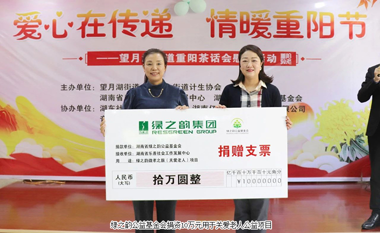 歲歲重陽,今又重陽。為進(jìn)一步弘揚(yáng)敬老孝親的文明德尚之風(fēng),2020年10月24日,綠之韻集團(tuán)董事總裁、綠之韻公益基金會理事長勞嘉,綠之韻集團(tuán)黨委書記、綠之韻公益基金會副理事長劉云帶領(lǐng)愛心志愿者參加在長沙舉行的重陽節(jié)主題茶話會慰問活動。會上,勞嘉理事長代表綠之韻公益基金會捐資10萬元用于關(guān)愛老人公益項(xiàng)目,為獨(dú)居老人、重疾高齡老人、計生特殊家庭和貧困家庭送去一份節(jié)日的溫暖。