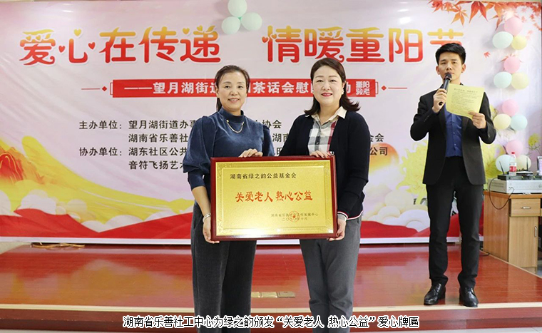 活動期間,湖南省綠之韻公益基金會向湖南省樂善社會工作發(fā)展中心捐贈10萬元用于綠之韻微孝之旅公益項(xiàng)目,此項(xiàng)目專門針對高齡老人、失獨(dú)老人、計生特殊家庭和貧困家庭進(jìn)行公益幫扶。湖南省樂善社會工作發(fā)展中心理事長羅樂為勞嘉理事長頒發(fā)“關(guān)愛老人 熱心公益”愛心牌匾。