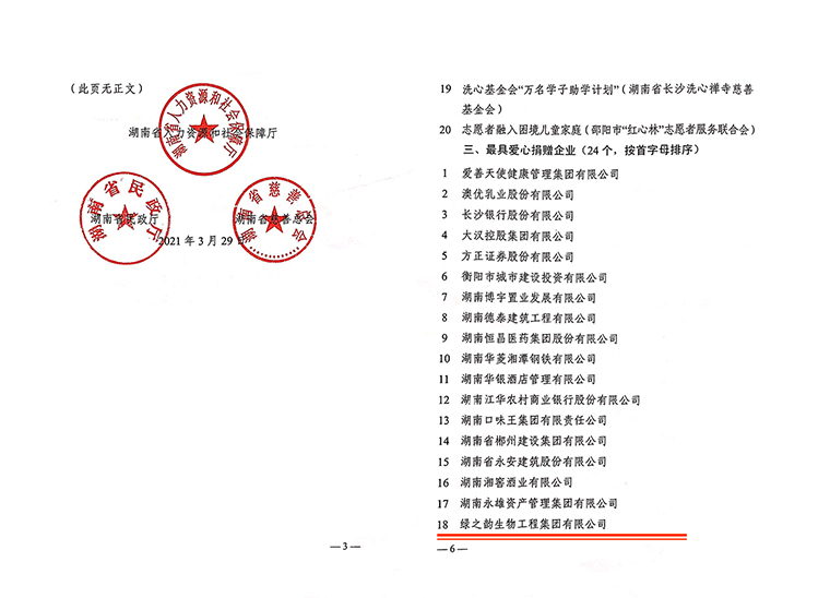 2021年5月19日,第四屆“湖南慈善獎”表彰大會在湖南賓館舉行。湖南省人民政府副省長朱忠明,省人民政府副秘書長彭翔,省人大社會建設(shè)委員會副主任委員卞鷹,省民政廳廳長曹忠平,湖南日報黨組書記、社長姜協(xié)軍,省人力資源社會保障廳黨組成員、副廳長焦華芳,省民政廳一級巡視員楊薇,省工商業(yè)聯(lián)合會二級巡視員劉建平等領(lǐng)導(dǎo)出席會議。湖南省慈善總會副會長、綠之韻集團董事長胡國安受邀參加會議。