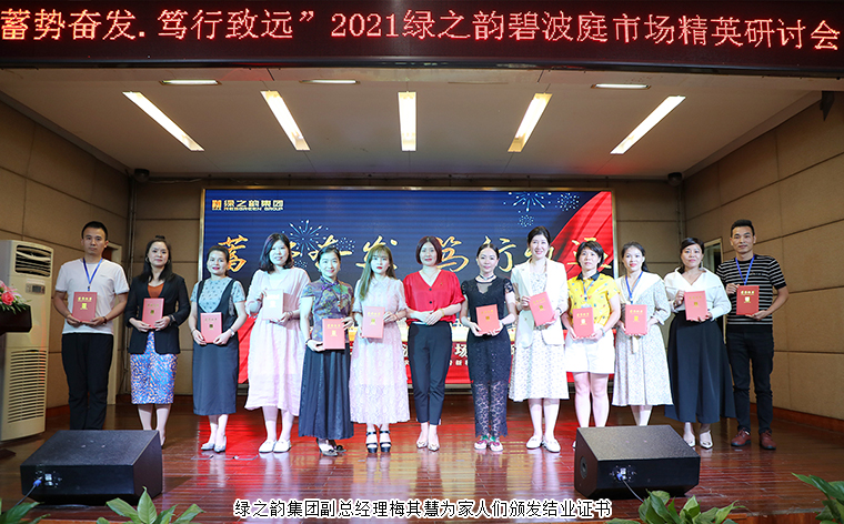 除了產(chǎn)品課程分享之外,各行業(yè)領(lǐng)域的大咖也帶來了精彩的專業(yè)知識培訓(xùn)。6月17日,大型紀(jì)錄片《曾國藩》導(dǎo)演、湖南電視臺制片人曾海波作《聽過曾國藩,從此不平凡》主題演講。同時,店鋪管理及業(yè)務(wù)流程、市場案例分析等專業(yè)課程的分享,都讓在座的綠之韻家人們收獲頗豐。培訓(xùn)臨近結(jié)束,綠之韻集團(tuán)副總經(jīng)理梅其慧作總結(jié)發(fā)言并頒發(fā)結(jié)業(yè)證書。她表示,此次研討會精心安排內(nèi)容豐富的培訓(xùn)課程,是希望大家能學(xué)有所感、學(xué)有所悟、學(xué)有所用,通過系統(tǒng)學(xué)習(xí),把今天“學(xué)”到的內(nèi)容“習(xí)”到明天的市場活動當(dāng)中。未來集團(tuán)公司和碧波庭也一定會繼續(xù)給予各位市場伙伴全方位的支持與幫助,全力為大家打造更優(yōu)質(zhì)的事業(yè)平臺,同心同德同行,為實(shí)現(xiàn)偉大的綠之韻碧波庭健康事業(yè)而努力奮斗。她相信,在大家的不懈努力下,綠之韻碧波庭的未來一定美好可期 。