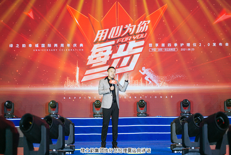 在全場熱烈的掌聲中,綠之韻集團(tuán)執(zhí)行總經(jīng)理夏運(yùn)良講話。他表示,今天是幸福國際的兩周年慶典,感謝公司每一位領(lǐng)導(dǎo)的鼓勵(lì),感謝每一位幸福國際家人們的陪伴與支持。今天大會(huì)的主題是“用心為你每一步”。我們的每一步是緊跟國家的發(fā)展腳步,積極響應(yīng)國家健康中國戰(zhàn)略,深耕大健康產(chǎn)業(yè),以“運(yùn)用現(xiàn)代科技將中華五千年養(yǎng)生文化及中醫(yī)理論發(fā)揚(yáng)光大”為使命,通過科技讓中醫(yī)養(yǎng)生智能化、簡單化、家庭化、全球化;我們的每一步是緊緊跟隨著綠之韻集團(tuán)和胡國安董事長的腳步,堅(jiān)持“以產(chǎn)品為導(dǎo)向”的理念,堅(jiān)持把支部建在連隊(duì)上,把自己扎根到市場;我們的每一步也是團(tuán)隊(duì)的腳步,綠之韻幸福國際是一個(gè)整體,通過團(tuán)隊(duì)合作實(shí)現(xiàn)大融合、大聯(lián)動(dòng)、大發(fā)展。希望每一位幸福代言人都能堅(jiān)持用心做事,為目標(biāo)、為愿景、為夢想付出努力。2021已經(jīng)過半,綠之韻幸福國際的未來,屬于那些看得懂和跟得上的人。2.0時(shí)代到來,我將和大家一起用心走好每一步,見證大家的每一步,讓我們拭目以待。