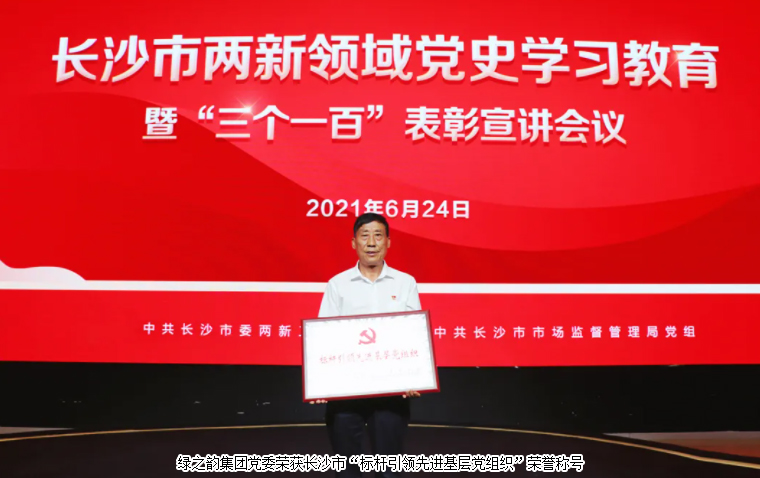 2021年6月24日,長(zhǎng)沙市兩新領(lǐng)域黨史學(xué)習(xí)教育暨“三個(gè)一百”表彰宣講會(huì)召開。中共長(zhǎng)沙市委常委、市委組織部部長(zhǎng)張宏益,市政協(xié)副主席、民盟市委主委、市市場(chǎng)監(jiān)督管理局局長(zhǎng)張慶和,中共長(zhǎng)沙市委組織部副部長(zhǎng)、兩新工委書記、基層辦主任楊俊,市民政局黨委書記、局長(zhǎng)、市委兩新工委副書記陳昌佳,市市場(chǎng)監(jiān)督局黨組書記、市委兩新工委副書記邱山東,市委兩新工委專職副書記肖劍鋒等領(lǐng)導(dǎo)出席會(huì)議。綠之韻集團(tuán)黨委副書記許達(dá)仲參加會(huì)議。會(huì)上,綠之韻集團(tuán)黨委榮獲長(zhǎng)沙市“標(biāo)桿引領(lǐng)先進(jìn)基層黨組織”榮譽(yù)稱號(hào)。