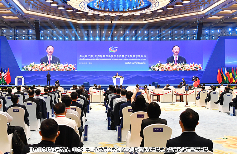 2021年9月26日,第二屆中國-非洲經(jīng)貿(mào)博覽會暨中非經(jīng)貿(mào)合作論壇在長沙隆重開幕。開幕式上,中共中央政治局委員、中央外事工作委員會辦公室主任楊潔篪致辭并宣布開幕。楊潔篪在致辭中說,中國和非洲是命運(yùn)與共、志同道合的好朋友、好伙伴、好兄弟。習(xí)近平主席親自提出真實(shí)親誠對非政策理念和正確義利觀,親自推動構(gòu)建更加緊密的中非命運(yùn)共同體,中非政治互信日益牢固,貿(mào)易投資、基礎(chǔ)設(shè)施、新興產(chǎn)業(yè)等領(lǐng)域務(wù)實(shí)合作碩果累累。