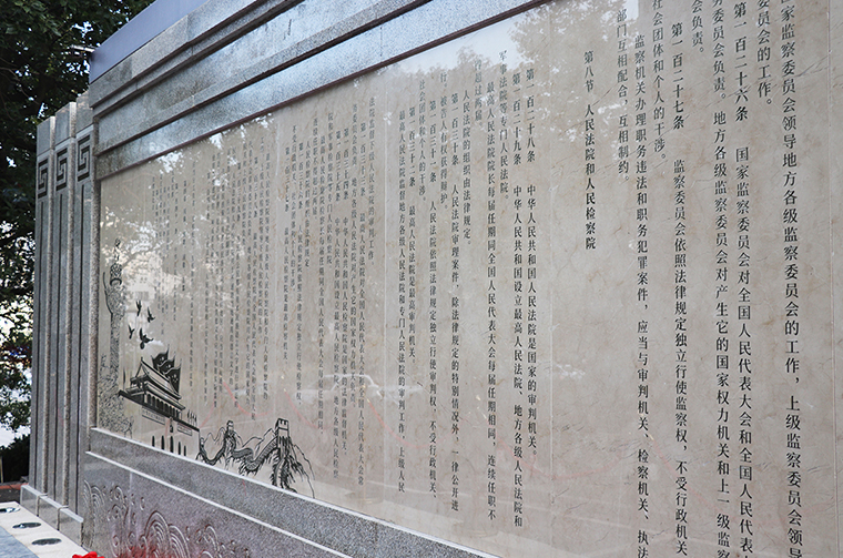 據(jù)了解,市人大機(jī)關(guān)憲法墻雕刻內(nèi)容為《中華人民共和國(guó)憲法》,從右至左、由上而下刻下了憲法全文,包括序言、四章、143條。整個(gè)憲法墻由八塊大理石墻面和20根方柱組成,總長(zhǎng)約70米,總面積約700平方米,有效體現(xiàn)了憲法作為國(guó)家根本大法的莊重與威嚴(yán),全面展現(xiàn)了憲法作為國(guó)家的根本法和治國(guó)安邦的總章程,在推動(dòng)和保障中國(guó)特色社會(huì)主義建設(shè)中的巨大作用。憲法墻的建立,旨在深入學(xué)習(xí)貫徹落實(shí)習(xí)近平法治思想、弘揚(yáng)憲法精神、助力憲法和法律的實(shí)施。與此同時(shí),憲法墻與機(jī)關(guān)黨建墻、長(zhǎng)沙人大歷史陳列室、基層立法聯(lián)系點(diǎn)一道,成為了市人大法治宣傳陣地的重要組成部分。