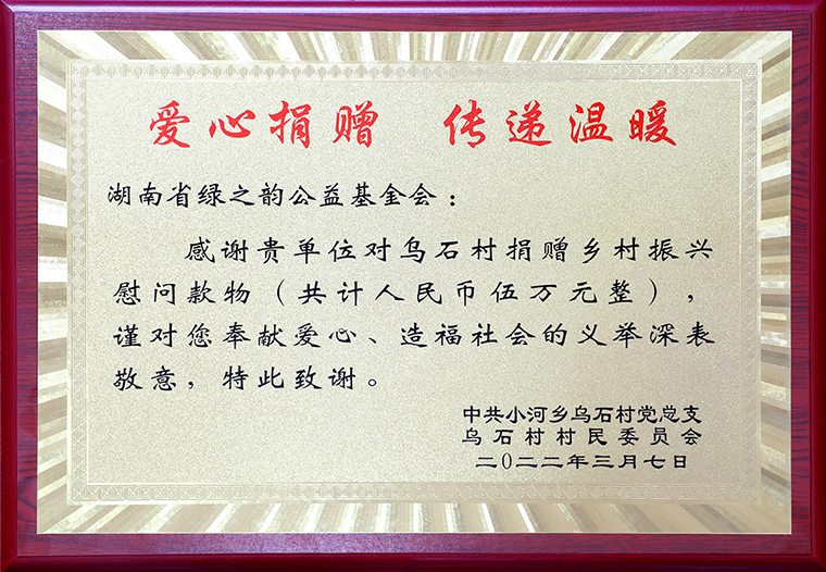 從2016年綠之韻第一次走進小河鄉(xiāng)開展愛心助學(xué)捐贈活動,到2017年與瀏陽市小河鄉(xiāng)簽訂三年定點精準幫扶協(xié)議,綠之韻每年走進瀏陽小河鄉(xiāng)烏石村開展農(nóng)產(chǎn)品直購會等精準幫扶活動,我們見證了小河鄉(xiāng)烏石村的改變和發(fā)展,共同描繪了“山青水綠鄉(xiāng)民和美”的美麗鄉(xiāng)村畫卷。為進一步鞏固脫貧攻堅成果同鄉(xiāng)村振興有效銜接,幫助解決烏石村當?shù)厝罕娚?、生產(chǎn)實際困難,2022年3月7日,綠之韻公益基金會與小河鄉(xiāng)烏石村村委共建慈善愛心驛站,創(chuàng)新企業(yè)公益幫扶新模式,引領(lǐng)鄉(xiāng)村振興再啟新程。