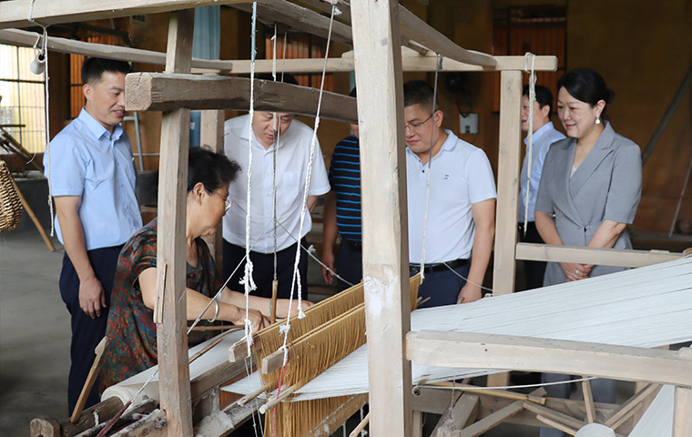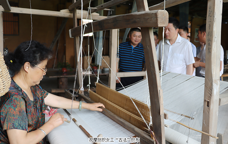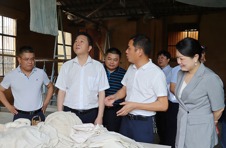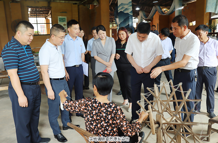 調研組一行首先來到卓然原鄉(xiāng)染坊就非遺傳承保護、文旅融合發(fā)展等工作進行考察,深入了解了原鄉(xiāng)染坊目前的經(jīng)營情況。原鄉(xiāng)染坊作為北盛鎮(zhèn)撈刀河畔·田園綜合體項目的旅游休閑項目,其織布、染色都是采用“古法”操作,即紡織女工們用木制紡車紡出一匹匹夏布后,染色師傅們再用從卓然村收購的荷花、荷葉、蓮蓬以及其他植物中提煉的染料給布匹著色。目前,染坊兼具生產、研學、文創(chuàng)三大功能,同時圍繞染坊延伸建造生態(tài)染織物種植基地、織染學院、織染博物館等文化新生態(tài)。