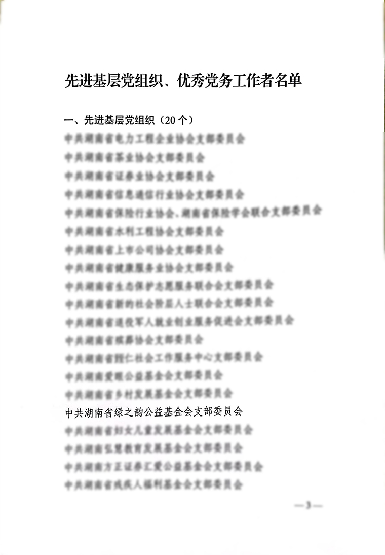 2022年7月1日,中共湖南省民政廳黨組、中共湖南省社會(huì)組織綜合委員會(huì)召開(kāi)“七一”表彰大會(huì),表彰優(yōu)秀黨員、先進(jìn)基層黨組織和優(yōu)秀黨務(wù)工作者。湖南省民政廳黨組書(shū)記、廳長(zhǎng)曹忠平,湖南省民政廳黨組成員、副廳長(zhǎng)張自銀,湖南省民政廳副廳長(zhǎng)、一級(jí)巡視員陳慈英,湖南省紀(jì)委派駐省民政廳紀(jì)檢組組長(zhǎng)謝衛(wèi)國(guó),湖南省民政廳副廳長(zhǎng)蔣建華、游勁民等領(lǐng)導(dǎo)出席會(huì)議。綠之韻集團(tuán)工會(huì)主席、綠之韻公益基金會(huì)黨支部書(shū)記馮紅參加會(huì)議。會(huì)上,中共湖南省綠之韻公益基金會(huì)支部委員會(huì)榮獲“先進(jìn)基層黨組織”榮譽(yù)稱號(hào)。