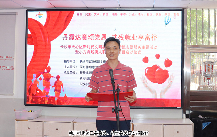 活動(dòng)伊始,新開鋪街道工委委員、組宣委員薛宏超致辭。他首先代表街道黨工委辦事處向關(guān)心支持幫助殘疾人朋友群體的各位領(lǐng)導(dǎo),各位嘉賓表示衷心的感謝。就業(yè)是殘疾人實(shí)現(xiàn)自身價(jià)值融入社會(huì),從根本上改善生活狀況的重要途徑,是落實(shí)民生為本的基本舉措,也是當(dāng)前社會(huì)文明進(jìn)步的重要標(biāo)志。一直以來(lái),街道高度重視殘疾人職業(yè)發(fā)展規(guī)劃,注重解決殘疾人就業(yè)問(wèn)題。通過(guò)引進(jìn)社會(huì)組織服務(wù)機(jī)構(gòu),挖掘公益性崗位,為殘疾人申請(qǐng)創(chuàng)業(yè)扶持補(bǔ)貼,為困難個(gè)體工商戶發(fā)放就業(yè)救助金等形式,為殘疾人士就業(yè)提供堅(jiān)實(shí)保障。