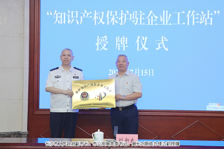 2022年7月15日,“知識(shí)產(chǎn)權(quán)保護(hù)駐企業(yè)工作站”授牌儀式在瀏陽經(jīng)開區(qū)舉行。長沙市人民政府副市長、市公安局黨委書記、局長劉新良,長沙市人民政府副秘書長譚海,長沙市公安局黨委委員、副局長彭遲平,瀏陽經(jīng)開區(qū)(高新區(qū))黨工委委員、管委會(huì)副主任唐建國,瀏陽市人民政府副市長、市公安局局長劉一斌以及長沙市公安局、長沙市知識(shí)產(chǎn)權(quán)局、瀏陽經(jīng)開區(qū)、瀏陽市市場(chǎng)監(jiān)督管理局、長沙市公安局知偵支隊(duì)等單位分管領(lǐng)導(dǎo)和部門負(fù)責(zé)人參加會(huì)議。長沙市公安局特邀監(jiān)督員、綠之韻集團(tuán)副總裁胡均安受邀參加會(huì)議。