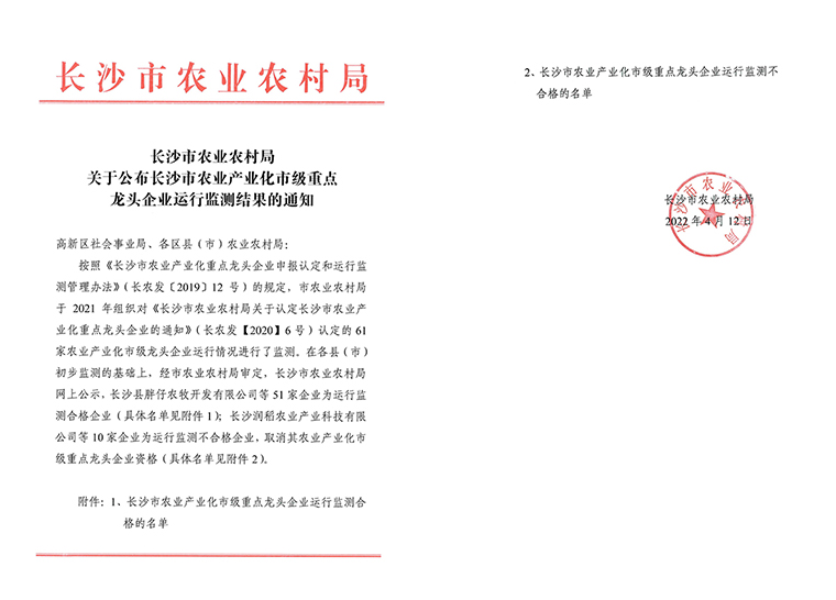 近日,按照《長(zhǎng)沙市農(nóng)業(yè)產(chǎn)業(yè)化重點(diǎn)龍頭企業(yè)申報(bào)認(rèn)定和運(yùn)行監(jiān)測(cè)管理辦法》的規(guī)定,市農(nóng)業(yè)農(nóng)村局于 2021?年組織對(duì)《長(zhǎng)沙市農(nóng)業(yè)農(nóng)村局關(guān)于認(rèn)定長(zhǎng)沙市農(nóng)業(yè)產(chǎn)業(yè)化重點(diǎn)龍頭企業(yè)的通知》認(rèn)定的61家農(nóng)業(yè)產(chǎn)業(yè)化市級(jí)龍頭企業(yè)運(yùn)行情況進(jìn)行了監(jiān)測(cè)。在各縣(市)初步監(jiān)測(cè)的基礎(chǔ)上,經(jīng)市農(nóng)業(yè)農(nóng)村局審定并網(wǎng)上公示,綠之韻生物工程集團(tuán)有限公司等51家企業(yè)為運(yùn)行監(jiān)測(cè)合格企業(yè),再次被認(rèn)定為“長(zhǎng)沙市農(nóng)業(yè)產(chǎn)業(yè)化重點(diǎn)龍頭企業(yè)”。