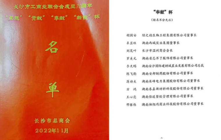 大會(huì)上頒發(fā)了“卓越”“貢獻(xiàn)”“奉獻(xiàn)”“新銳”杯四個(gè)企業(yè)家獎(jiǎng)項(xiàng)。自2003年創(chuàng)立綠之韻集團(tuán)以來(lái),胡國(guó)安董事長(zhǎng)帶領(lǐng)綠之韻集團(tuán)在發(fā)展實(shí)業(yè)的同時(shí),積極承擔(dān)社會(huì)責(zé)任,產(chǎn)業(yè)富民,回饋社會(huì)。在振興實(shí)業(yè)的同時(shí),綠之韻積極承擔(dān)企業(yè)公民責(zé)任,踴躍參與了100多項(xiàng)社會(huì)公益項(xiàng)目,涉及賑災(zāi)濟(jì)困、興教助學(xué)、孤殘救助、醫(yī)療衛(wèi)生、修路飲水、養(yǎng)老醫(yī)療等多個(gè)領(lǐng)域,累計(jì)捐款捐物達(dá)7600多萬(wàn)元。憑借帶領(lǐng)綠之韻集團(tuán)在企業(yè)經(jīng)營(yíng)發(fā)展、稅收貢獻(xiàn)、社會(huì)責(zé)任打造等方面的出色表現(xiàn),胡國(guó)安董事長(zhǎng)榮獲“奉獻(xiàn)杯”民營(yíng)企業(yè)家獎(jiǎng)項(xiàng)。獲此殊榮,胡國(guó)安董事長(zhǎng)表示:2022年是黨的二十大召開(kāi)之年,是“十四五”規(guī)劃實(shí)施的關(guān)鍵一年,是進(jìn)入全面建設(shè)社會(huì)主義現(xiàn)代化國(guó)家、向第二個(gè)百年奮斗目標(biāo)進(jìn)軍新征程的重要一年,也是綠之韻集團(tuán)“四五規(guī)劃”的收官之年。綠之韻作為一家立足長(zhǎng)沙這片紅色沃土的民營(yíng)企業(yè),將勇?lián)鷼v史使命,自覺(jué)把企業(yè)發(fā)展同國(guó)家、民族命運(yùn)連接起來(lái),把企業(yè)實(shí)際和長(zhǎng)沙發(fā)展優(yōu)勢(shì)結(jié)合起來(lái),以“優(yōu)企業(yè)”助力“強(qiáng)省會(huì)”。同時(shí),要努力做回報(bào)社會(huì)的典范,繼續(xù)在各級(jí)領(lǐng)導(dǎo)的指導(dǎo)和支持下,帶領(lǐng)企業(yè)繼續(xù)服務(wù)三農(nóng)產(chǎn)業(yè),助力鄉(xiāng)村振興;堅(jiān)持創(chuàng)新創(chuàng)造,引領(lǐng)企業(yè)高質(zhì)量發(fā)展;積極履行企業(yè)公民責(zé)任,投身公益慈善事業(yè);積極融入長(zhǎng)沙“強(qiáng)省會(huì)”戰(zhàn)略的恢弘征程,為鞏固拓展脫貧攻堅(jiān)成果、助推鄉(xiāng)村振興、全面建設(shè)現(xiàn)代化長(zhǎng)沙、全力推動(dòng)高質(zhì)量發(fā)展作出新的貢獻(xiàn)!