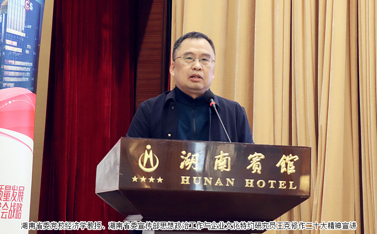 湖南省政協(xié)副主席、省工商聯(lián)主席張健講話。他首先代表湖南省工商聯(lián)向大會(huì)的召開表示熱烈的祝賀,向參會(huì)的各位嘉賓和企業(yè)家代表致以誠摯的問候。習(xí)近平總書記在黨的二十大報(bào)告中指出“推進(jìn)文化自信自強(qiáng),鑄就社會(huì)主義文化新輝煌”。企業(yè)文化建設(shè)是企業(yè)可持續(xù)發(fā)展的內(nèi)在動(dòng)力,決定著企業(yè)的戰(zhàn)略方向、經(jīng)營理念、管理水平和員工素質(zhì),決定著企業(yè)的核心競(jìng)爭(zhēng)力。要深入學(xué)習(xí)貫徹黨的二十大精神和習(xí)近平總書記的系列講話精神,大力弘揚(yáng)偉大建黨精神,加強(qiáng)政治引領(lǐng),凝聚智慧力量,堅(jiān)定文化自信,推動(dòng)企業(yè)文化建設(shè)工作品牌的打造,團(tuán)結(jié)引領(lǐng)廣大民營經(jīng)濟(jì)人士,以優(yōu)質(zhì)高效的服務(wù)推動(dòng)民營經(jīng)濟(jì)高質(zhì)量發(fā)展,全面落實(shí)“三高四新”的戰(zhàn)略定位和使命任務(wù),為全面建設(shè)富強(qiáng)民主文明和諧美麗的社會(huì)主義現(xiàn)代化強(qiáng)國貢獻(xiàn)我們民營經(jīng)濟(jì)的力量。