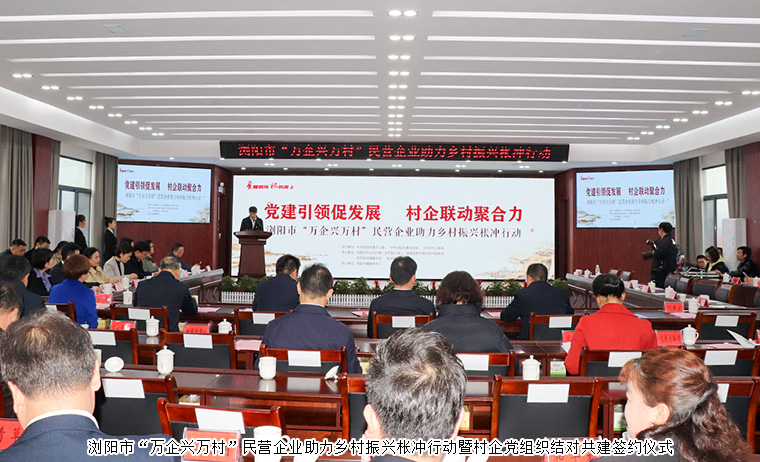 黨建引領(lǐng)促發(fā)展,村企聯(lián)動聚合力。2023年3月23日,瀏陽市“萬企興萬村”民營企業(yè)助力鄉(xiāng)村振興棖沖行動暨村企黨組織結(jié)對共建簽約儀式在瀏陽市棖沖鎮(zhèn)舉行。中共瀏陽市委副書記、統(tǒng)戰(zhàn)部部長戴武明,中共瀏陽市委常委、組織部部長唐安石,中共瀏陽市委常委、市委辦主任王坤球,瀏陽市人大常委會黨組成員、副主任唐洪勝,瀏陽市人民政府副市長劉來宏,瀏陽市政協(xié)副主席、市工商聯(lián)主席陳靜等領(lǐng)導(dǎo)出席活動。瀏陽市相關(guān)單位和部門負(fù)責(zé)人,棖沖鎮(zhèn)全體黨政領(lǐng)導(dǎo),村黨總支書記、主任,鄉(xiāng)村振興駐村第一書記以及結(jié)對幫扶企業(yè)代表參加活動。綠之韻集團(tuán)黨委書記劉云代表公司受邀參加活動。